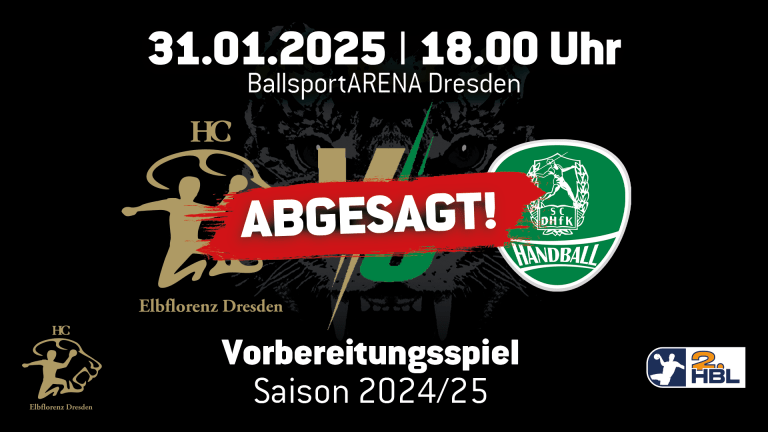 Krankheitswelle setzt Leipziger Team außer Gefecht Das für Freitag, 31. Januar 2025 geplante Testspiel zwischen dem HC Elbflorenz Dresden und dem SC DHfK Leipzig muss leider kurzfristig abgesagt werden. Aufgrund zahlreicher krankheitsbedingter Ausfälle steht dem SC DHfK keine ausreichend besetzte Mannschaft zur Verfügung. Bereits gekaufte Tickets werden zurückerstattet. Die Rückabwicklung erfolgt über die jeweilige Vorverkaufsstelle, an der die Tickets erworben...