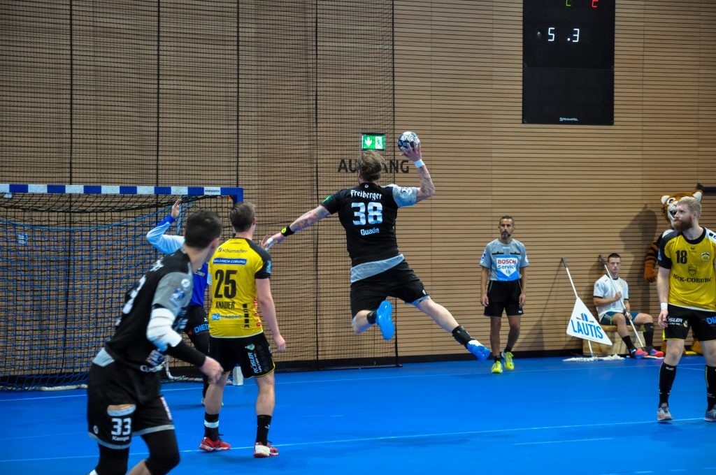 Schon die ersten Minuten deuteten an, dass  Buschmann schon vor dem Spiel von diesen Worten überzeugt war. Es deutete sich außerdem schon früh ein torreiches Spiel an und die Tatsache, dass der HC diesmal nicht den Start verschlafen würde. Nach 4 Minuten waren schon 8 Tore gefallen und der HSC führte mit 5:3. Beide Teams blieben sich in der Folge kaum etwas schuldig. In der 11. Minute konnte Nils Kretschmer dann zum 7:7 ausgleichen. Nach einem im Anschluss gehaltenen Strafwurf durch Mario Huhnstock konnten die Gastgeber durch Henning Quade vom Kreis sogar in Führung gehen (8:7). Bis zum Schluss gab man diese Führung nicht mehr ab. Wie schon in den vergangenen Spielen drückten die Dresdner mächtig aufs Tempo und hatten damit Erfolg. So führte die Pöhler-Sieben durch einen Treffer von Oskar Emanuel in der 21. Minute erstmalig mit 3 Toren (12:9). Bis zum 17:14 durch Sebastian Greß in Überzahl, hatte der Vorsprung bestand. In der restlichen 1. Halbzeit konnten die Oberfranken, immer wieder angeführt von Tobias Varvne, noch einmal näher an den HC heranrücken. So ging es nach einer torreichen Halbzeit mit einer knappen Führung für den HC in die Halbzeitpause (18:17). Die erste Halbzeit sah ein starkes Kreisläuferspiel durch beide Teams, wobei der zu Beginn bärenstarke Markus Hagelin durch die Dresdner-Abwehr immer mehr aus dem Spiel genommen wurde, während HC-Kreis Henning Quade so viel Tore in 60 Minuten erzielte, wie seit der Jugendnationalmannschaft nicht mehr. Er wirkte an diesem Tag wie die handballerische Ausführung von „Magneto“, denn er zog die Bälle wie automatisch an. Zudem wurde trotz der 17 Gegentore ersichtlich, dass der HC den gefährlichen Coburger Rückraum in Teilen richtig gut im Griff hatte. Weder Anton Prakapenia noch Pontus Zetterman kamen wirklich zur Entfaltung und in der 2. Halbzeit überhaupt nicht mehr. „Gefühlt hätte Dresden schon zur Halbzeit höher führen können und wir sind noch ganz gut dabei weggekommen“, sagte HSC-Trainer Jan Gorr nach der Partie.
