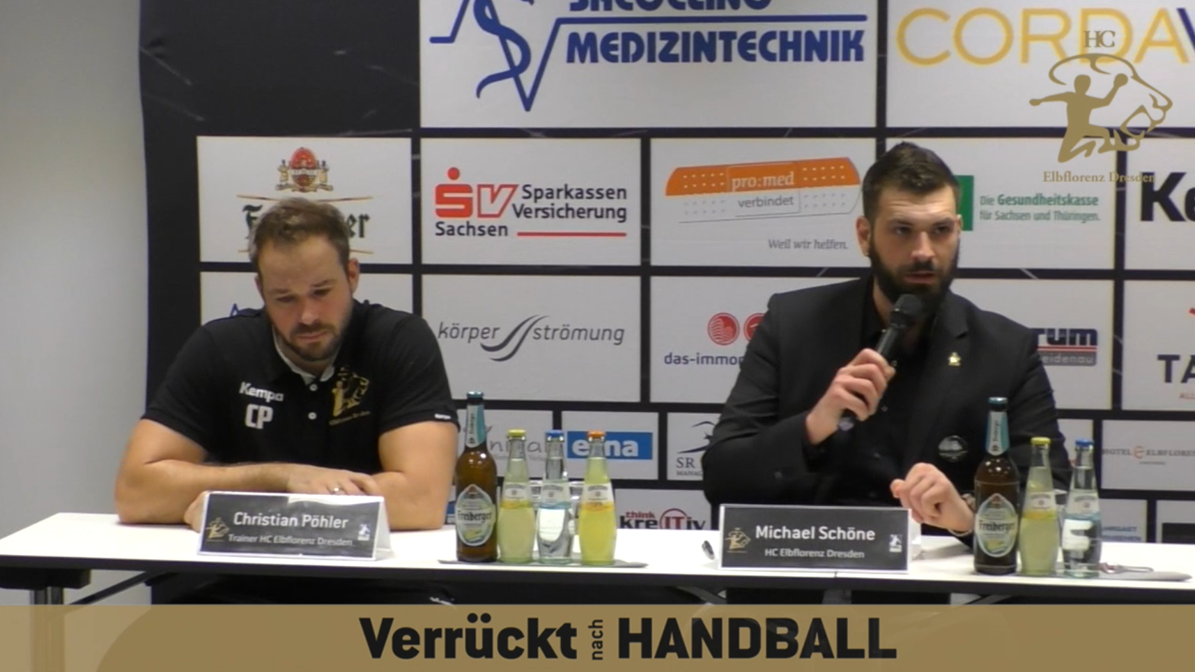 Beide Cheftrainer, Torge Greve (Vfl Lübeck-Schwartau) und Christian Pöhler (HC Elbflorenz), beim Pressegespräch mit Michael Schöne am 22. Spieltag.