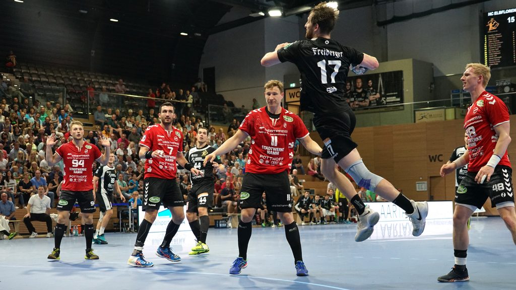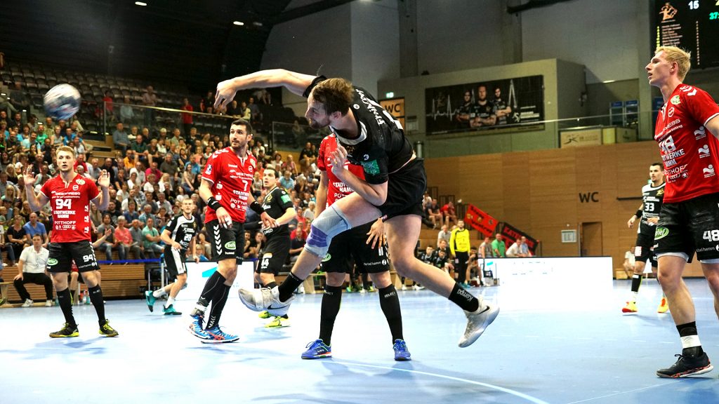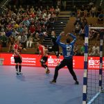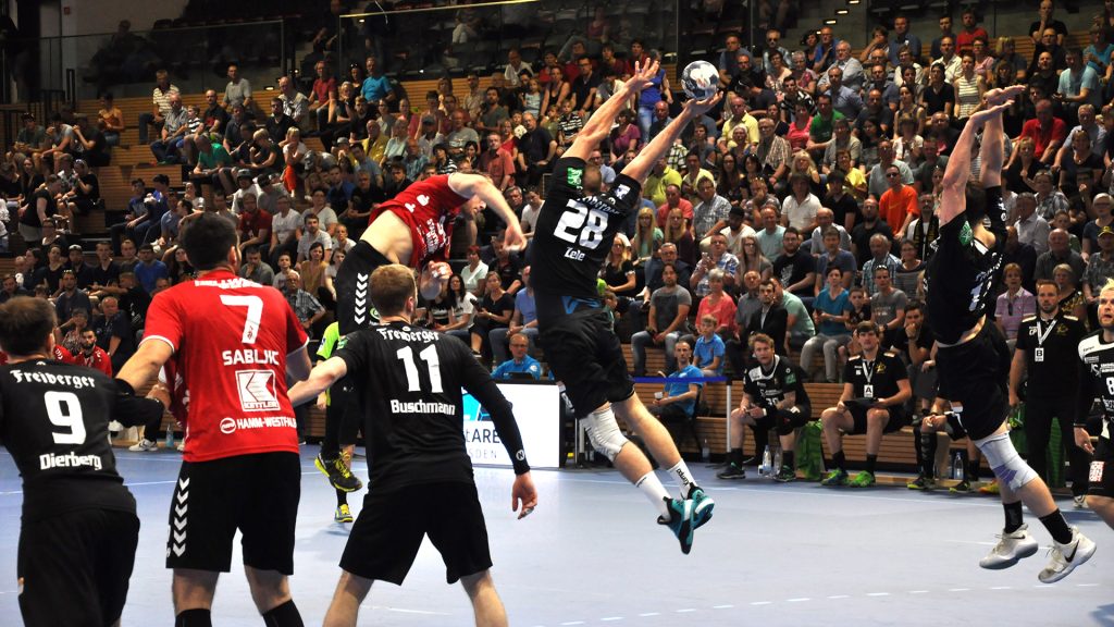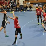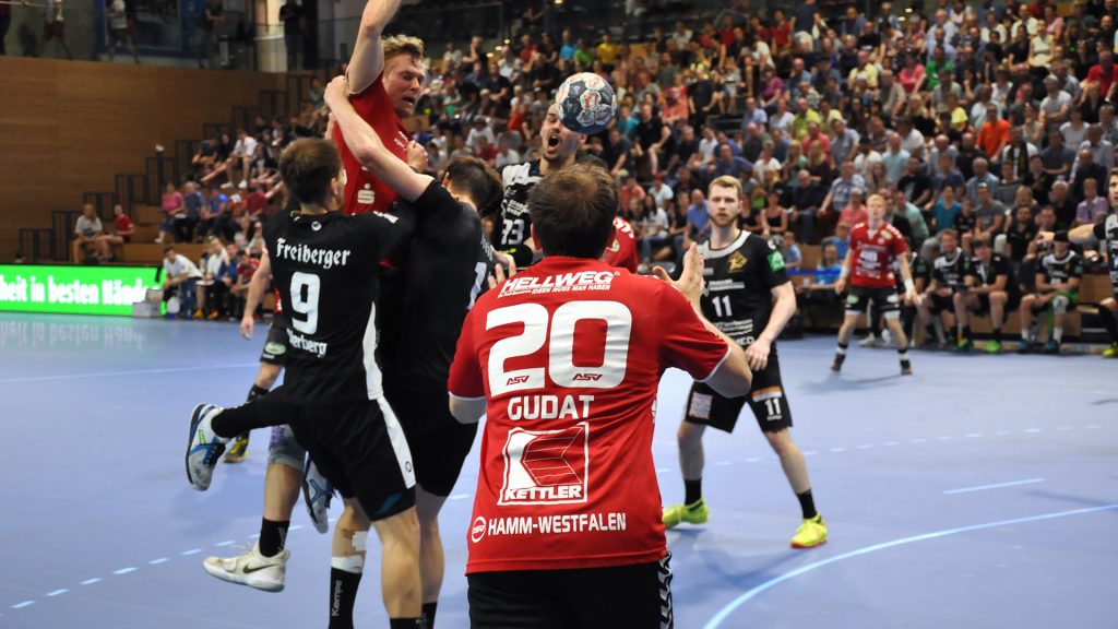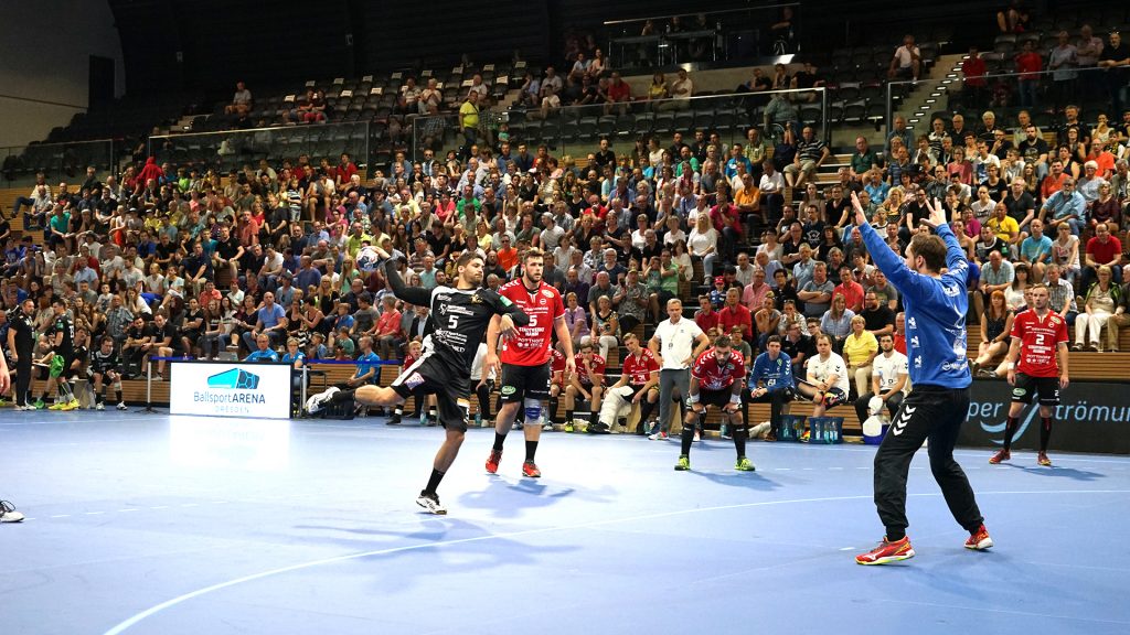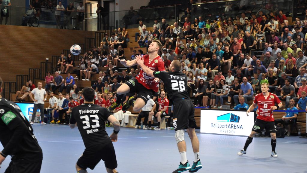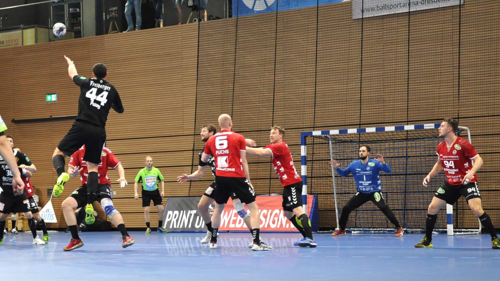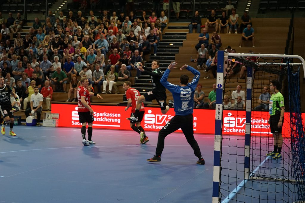 Der HC präsentierte sich über weite Strecken der 1. Halbzeit sehr gut. Die Kombination Abwehr und Torhüter schaffte es die Gäste bis zur Halbzeit bei 9 Toren zu halten. Vor allem Mario Huhnstock im Tor der Sachsen lief zur Höchstform auf. Er parierte im 1. Spielabschnitt 9 Bälle und das teilweise spektakulär. Die Gäste aus Hamm taten sich vor allem die Anfangsviertelstunde sehr schwer. So führte der HC nach 18 Minuten mit 7:3. ASV Coach Kay Rothenpieler hatte schon in der 12. Minute eine Auszeit genommen, um seine Mannschaft positiv zu beeinflussen. Auch wenn sich der ASV ab der 20. Minute steigern konnte, waren die Dresdner doch weiter spielbestimmend. Beide Spielmacher des HC Roman Becvar sowie Arseniy Buschmann hielten die Fäden im HC-Angriff klug in der Hand. Im letzten Drittel der 1. Halbzeit pendelte sich der Vorsprung zwischen 2 und 3 Toren ein, wobei die Westfalen sehr oft vor allem über den Kreis erfolgreich waren. Der sonst so starke ASV-Aufbau blieb zunächst erst einmal weitestgehend wirkungslos. Mit dem 12:9 vom Kreis durch Norman Flödl setzten die Dresdner dann einen spektakulären Schlusspunkt auf starke 30 HC-Minuten. 5 Sekunden waren noch zu spielen als Norman Flödl durch einen „Raketenpass“ jenseits der Mittellinie bedient wurden und sich dann gegen zwei Deckungsspieler durchsetzte, um mit links (seinem Nichtwurfarm) das Tor zu erzielen. ASV Kay Rothenpieler sagte nach der Partie: „Ich habe meinem Team in der Kabine gesagt, dass wir trotz unserer Leistung ja nur 12:9 zurückliegen und das wir jetzt noch eine richtig gute Halbzeit spielen wollen.“ Wermutstropfen war für den HC leider die Verletzung von Nils Kretschmer, der sich bei einer spektakulären Rettungsaktion in der 1. Halbzeit so verletzt hatte, dass er sofort ins Krankenhaus musste.