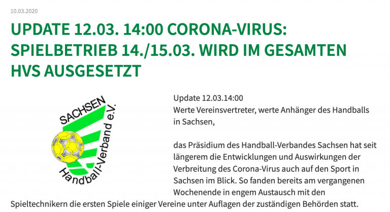 Aufgrund der aktuellen Entwicklung rund um das Coronavirus stellen alle Nachwuchsmannschaften, die dritte Männermannschaft und die vierte Männermannschaft ab sofort den Trainingsbetrieb ein. Diese Anordnung gilt vorerst bis zum 30.03.2020. Die vorbereitenden Maßnahmen zur Schließung von Schulen und Kitas durch Sachsens Kultusministerium vom 13.03.2020 haben den permanenten Austausch im Vorstand des HC Elbflorenz 2006 e.V. über eine Aussetzung des Trainingsbetriebs...