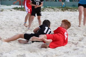 Da beim Beachhandball die Punktvergabe pro Halbzeit fällt (1 Punkt pro gewonnener Halbzeit), waren bei 4 Spielen 8 Punkte möglich. Diese erreichten die Jungs der JSpG. Allerdings war besonders das zweite Spiel gegen die gut spielenden Jungs in Blau sehr ausgeglichen – hatten wir doch ebenso viele Chancen, wussten diese nur nicht zu nutzen. Gegen die rote Lok aus Schönebeck konnten wir das erste Spiel mit 2:0 Punkten gewinnen, ehe wir in Spiel 2 mit 1:2 nach Penaltywerfen unterlegen waren.