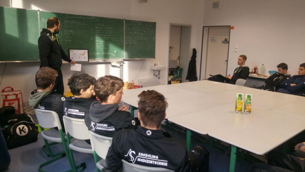Pünktlich um 11 Uhr waren dann aber alle Jungs zum Teammeeting im Klassenraum angekommen – geklärt wurden die Ziele der Jungs beim Turnier und wie sie selber dahin kommen wollen. Ebenso gab es eine erste taktische Einstimmung von Trainer Kay Blasczyk.