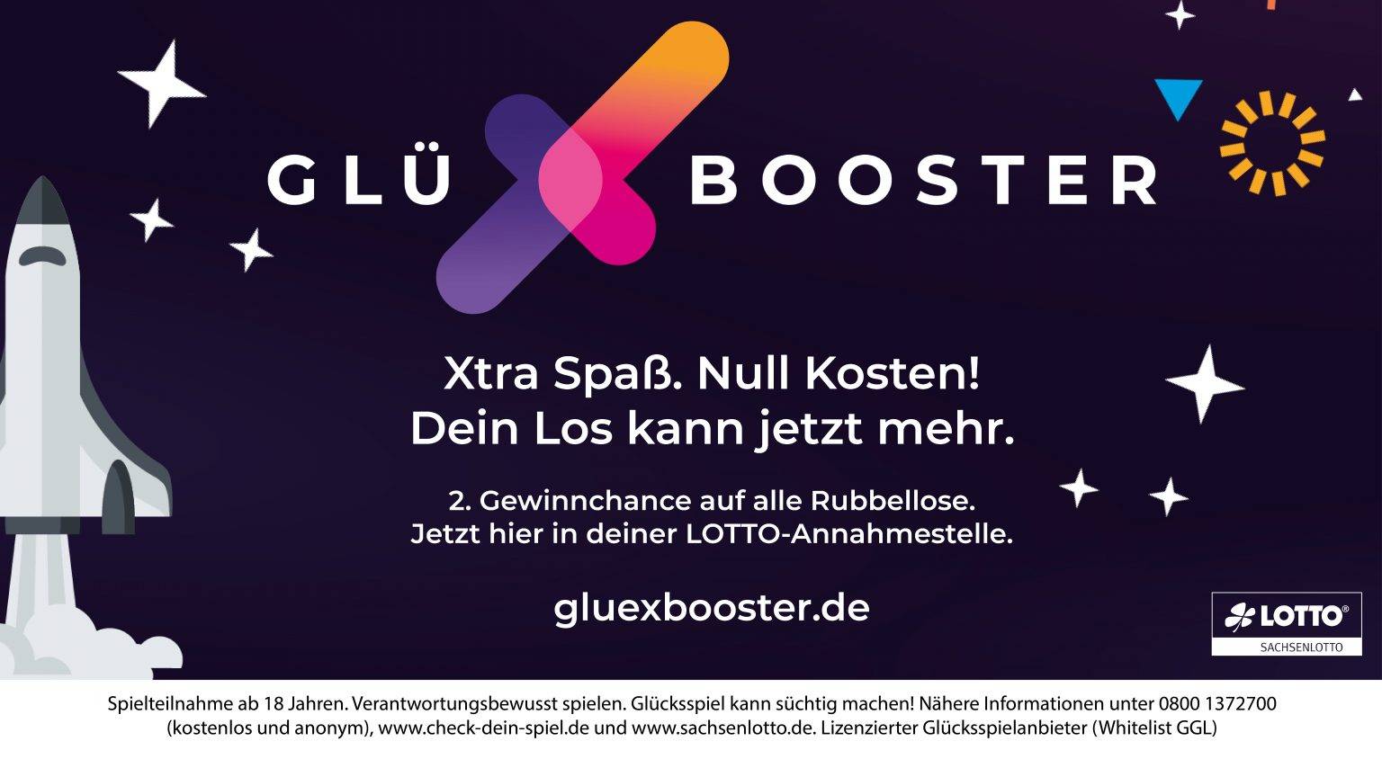 Ab sofort kann das Sachsenlotto-Rubbellos noch mehr: Denn mit dem neuen Portal GlüXBooster erhalten alle Loskäufer in der Annahmestelle eine zusätzliche kostenlose Gewinnchance – ganz egal, ob Niete oder Gewinnlos. Der Code verwandelt die Lose dabei in sogenannte Boosterpunkte, die dann für wöchentliche Gewinnspiele eingesetzt werden können.
