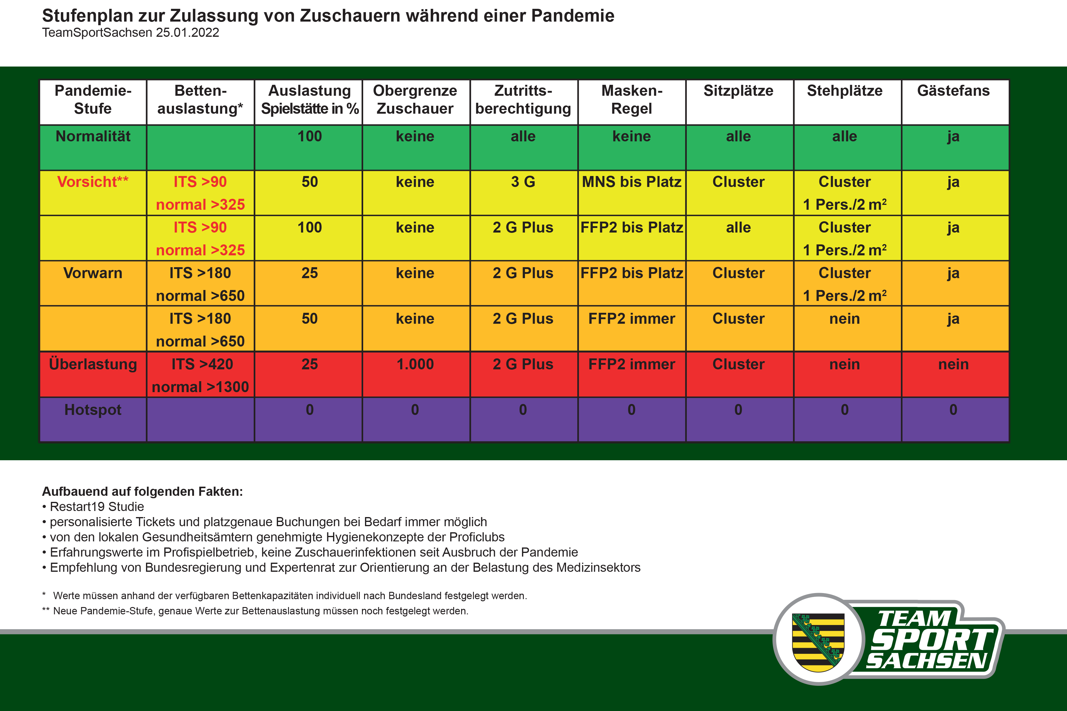 Der Stufenplan baut neben den Erkenntnissen der Restart19-Studie und dem bisherigen Entwurf des Sächsisches Staatsministeriums für Soziales und Gesellschaftlichen Zusammenhalt vor allem auf erprobte sowie von den lokalen Gesundheitsämtern geprüfte und genehmigte Hygienekonzepte auf. Er wurde durch praktische Erfahrungen und das Feedback aller Vereine im Profispielbetrieb weiterentwickelt und folgt den Empfehlungen zur Orientierung aller Maßnahmen an der Belastung des Medizinsektors anstelle von Inzidenzwerten. Personalisierte Tickets und platzgenaue Buchungen zur Kontaktnachverfolgung sind darin ebenso als Sicherheitsinstrumente implementiert wie FFP2-Masken zum Schutz vor Übertragungen. Auslastungsgrad der Spielstätte, Zugangsberechtigungen je nach Impfschutz oder die Zulassung von Stehplätzen und Gästefans orientieren sich an der jeweiligen Belegung von Krankenhausbetten durch Covid19-Patienten im Bundesland und sind unterteilt in fünf Stufen.